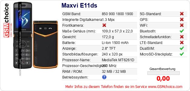 Hast du eigene Webseite? Willst du die Informationen über Standarddaten des Handys Maxvi E11ds irgendwo veröffentlichen? Das ist sehr einfach. Du kannst das Bild herunterladen oder kopieren und auf der Webseite folgenden Code hinzufügen:Das Einfügen von diesem Code verursacht das Anzeigen von dem folgenden Bild: