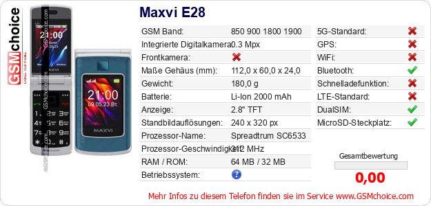 Hast du eigene Webseite? Willst du die Informationen über Standarddaten des Handys Maxvi E28 irgendwo veröffentlichen? Das ist sehr einfach. Du kannst das Bild herunterladen oder kopieren und auf der Webseite folgenden Code hinzufügen:Das Einfügen von diesem Code verursacht das Anzeigen von dem folgenden Bild: