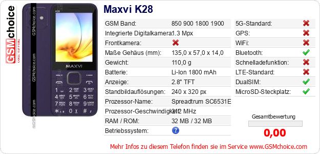 Hast du eigene Webseite? Willst du die Informationen über Standarddaten des Handys Maxvi K28 irgendwo veröffentlichen? Das ist sehr einfach. Du kannst das Bild herunterladen oder kopieren und auf der Webseite folgenden Code hinzufügen:Das Einfügen von diesem Code verursacht das Anzeigen von dem folgenden Bild: