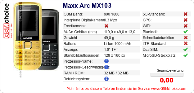 Hast du eigene Webseite? Willst du die Informationen über Standarddaten des Handys Maxx Arc MX103 irgendwo veröffentlichen? Das ist sehr einfach. Du kannst das Bild herunterladen oder kopieren und auf der Webseite folgenden Code hinzufügen:Das Einfügen von diesem Code verursacht das Anzeigen von dem folgenden Bild: