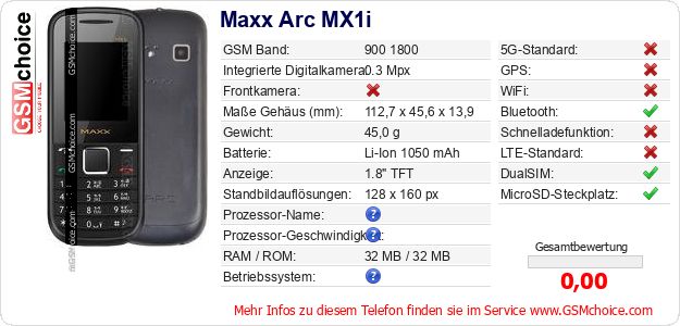 Hast du eigene Webseite? Willst du die Informationen über Standarddaten des Handys Maxx Arc MX1i irgendwo veröffentlichen? Das ist sehr einfach. Du kannst das Bild herunterladen oder kopieren und auf der Webseite folgenden Code hinzufügen:Das Einfügen von diesem Code verursacht das Anzeigen von dem folgenden Bild: