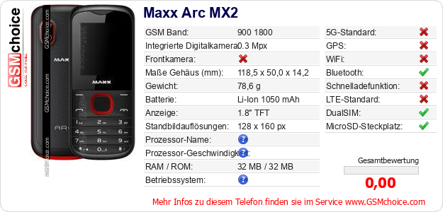 Hast du eigene Webseite? Willst du die Informationen über Standarddaten des Handys Maxx Arc MX2 irgendwo veröffentlichen? Das ist sehr einfach. Du kannst das Bild herunterladen oder kopieren und auf der Webseite folgenden Code hinzufügen:Das Einfügen von diesem Code verursacht das Anzeigen von dem folgenden Bild: