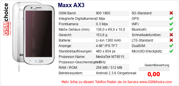 Hast du eigene Webseite? Willst du die Informationen über Standarddaten des Handys Maxx AX3 irgendwo veröffentlichen? Das ist sehr einfach. Du kannst das Bild herunterladen oder kopieren und auf der Webseite folgenden Code hinzufügen:Das Einfügen von diesem Code verursacht das Anzeigen von dem folgenden Bild: