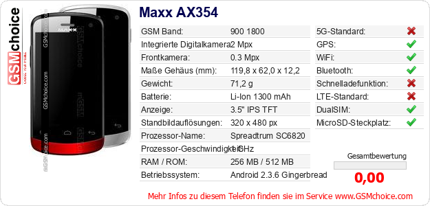 Hast du eigene Webseite? Willst du die Informationen über Standarddaten des Handys Maxx AX354 irgendwo veröffentlichen? Das ist sehr einfach. Du kannst das Bild herunterladen oder kopieren und auf der Webseite folgenden Code hinzufügen:Das Einfügen von diesem Code verursacht das Anzeigen von dem folgenden Bild: