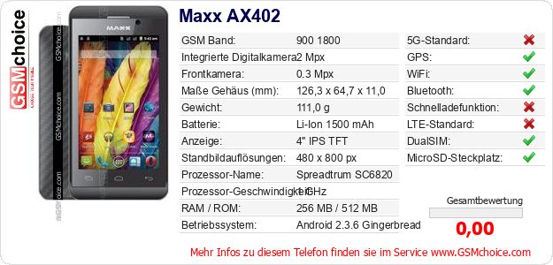 Hast du eigene Webseite? Willst du die Informationen über Standarddaten des Handys Maxx AX402 irgendwo veröffentlichen? Das ist sehr einfach. Du kannst das Bild herunterladen oder kopieren und auf der Webseite folgenden Code hinzufügen:Das Einfügen von diesem Code verursacht das Anzeigen von dem folgenden Bild: