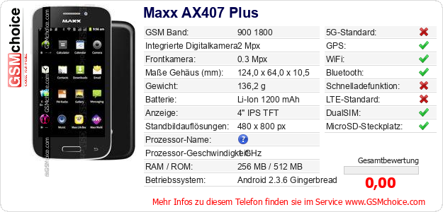 Hast du eigene Webseite? Willst du die Informationen über Standarddaten des Handys Maxx AX407 Plus irgendwo veröffentlichen? Das ist sehr einfach. Du kannst das Bild herunterladen oder kopieren und auf der Webseite folgenden Code hinzufügen:Das Einfügen von diesem Code verursacht das Anzeigen von dem folgenden Bild: