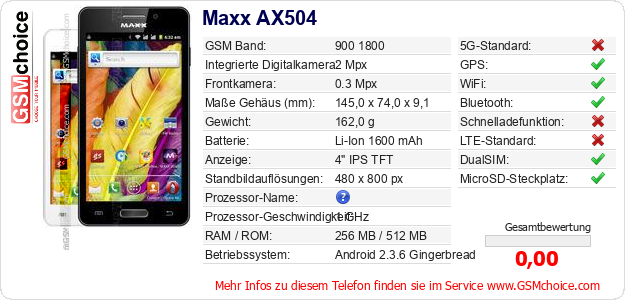 Hast du eigene Webseite? Willst du die Informationen über Standarddaten des Handys Maxx AX504 irgendwo veröffentlichen? Das ist sehr einfach. Du kannst das Bild herunterladen oder kopieren und auf der Webseite folgenden Code hinzufügen:Das Einfügen von diesem Code verursacht das Anzeigen von dem folgenden Bild: