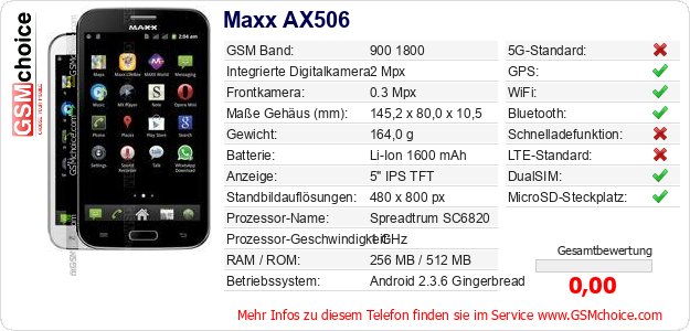 Hast du eigene Webseite? Willst du die Informationen über Standarddaten des Handys Maxx AX506 irgendwo veröffentlichen? Das ist sehr einfach. Du kannst das Bild herunterladen oder kopieren und auf der Webseite folgenden Code hinzufügen:Das Einfügen von diesem Code verursacht das Anzeigen von dem folgenden Bild: