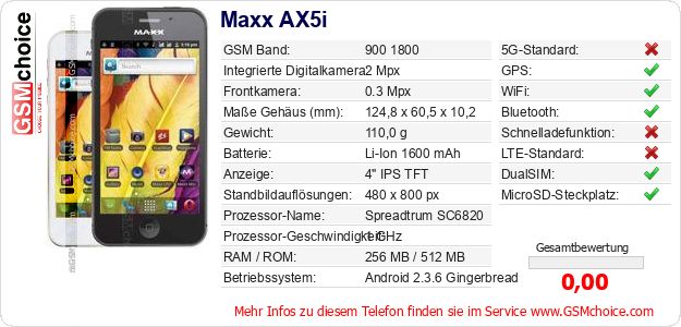 Hast du eigene Webseite? Willst du die Informationen über Standarddaten des Handys Maxx AX5i irgendwo veröffentlichen? Das ist sehr einfach. Du kannst das Bild herunterladen oder kopieren und auf der Webseite folgenden Code hinzufügen:Das Einfügen von diesem Code verursacht das Anzeigen von dem folgenden Bild: