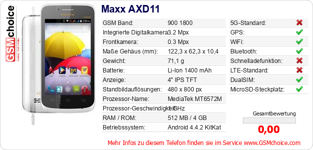 Hast du eigene Webseite? Willst du die Informationen über Standarddaten des Handys Maxx AXD11 irgendwo veröffentlichen? Das ist sehr einfach. Du kannst das Bild herunterladen oder kopieren und auf der Webseite folgenden Code hinzufügen:Das Einfügen von diesem Code verursacht das Anzeigen von dem folgenden Bild: