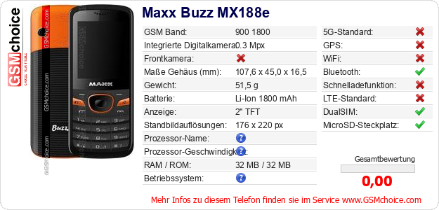 Hast du eigene Webseite? Willst du die Informationen über Standarddaten des Handys Maxx Buzz MX188e irgendwo veröffentlichen? Das ist sehr einfach. Du kannst das Bild herunterladen oder kopieren und auf der Webseite folgenden Code hinzufügen:Das Einfügen von diesem Code verursacht das Anzeigen von dem folgenden Bild: