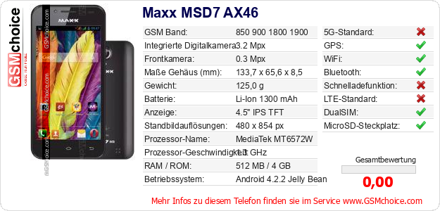 Hast du eigene Webseite? Willst du die Informationen über Standarddaten des Handys Maxx MSD7 AX46 irgendwo veröffentlichen? Das ist sehr einfach. Du kannst das Bild herunterladen oder kopieren und auf der Webseite folgenden Code hinzufügen:Das Einfügen von diesem Code verursacht das Anzeigen von dem folgenden Bild: