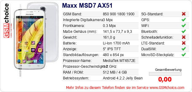 Hast du eigene Webseite? Willst du die Informationen über Standarddaten des Handys Maxx MSD7 AX51 irgendwo veröffentlichen? Das ist sehr einfach. Du kannst das Bild herunterladen oder kopieren und auf der Webseite folgenden Code hinzufügen:Das Einfügen von diesem Code verursacht das Anzeigen von dem folgenden Bild: