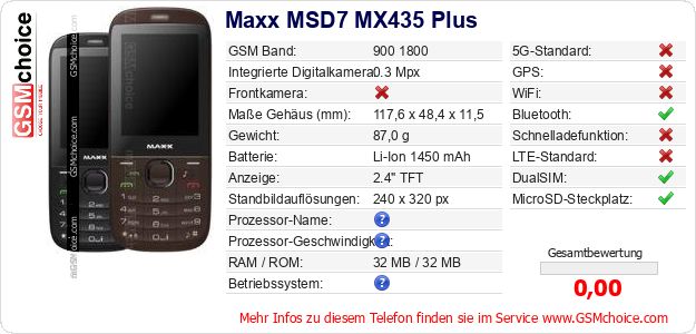 Hast du eigene Webseite? Willst du die Informationen über Standarddaten des Handys Maxx MSD7 MX435 Plus irgendwo veröffentlichen? Das ist sehr einfach. Du kannst das Bild herunterladen oder kopieren und auf der Webseite folgenden Code hinzufügen:Das Einfügen von diesem Code verursacht das Anzeigen von dem folgenden Bild: