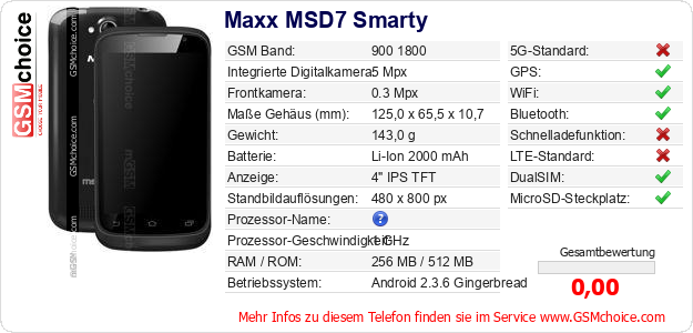 Hast du eigene Webseite? Willst du die Informationen über Standarddaten des Handys Maxx MSD7 Smarty irgendwo veröffentlichen? Das ist sehr einfach. Du kannst das Bild herunterladen oder kopieren und auf der Webseite folgenden Code hinzufügen:Das Einfügen von diesem Code verursacht das Anzeigen von dem folgenden Bild: