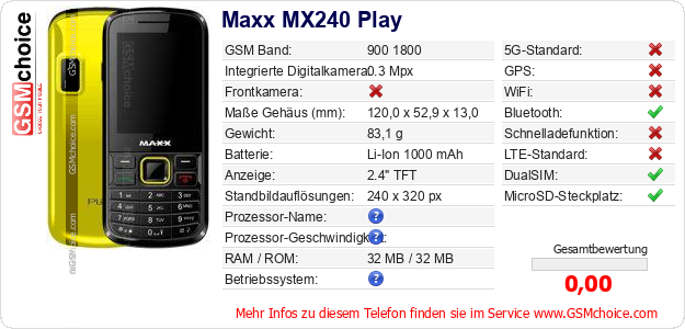 Hast du eigene Webseite? Willst du die Informationen über Standarddaten des Handys Maxx MX240 Play irgendwo veröffentlichen? Das ist sehr einfach. Du kannst das Bild herunterladen oder kopieren und auf der Webseite folgenden Code hinzufügen:Das Einfügen von diesem Code verursacht das Anzeigen von dem folgenden Bild: