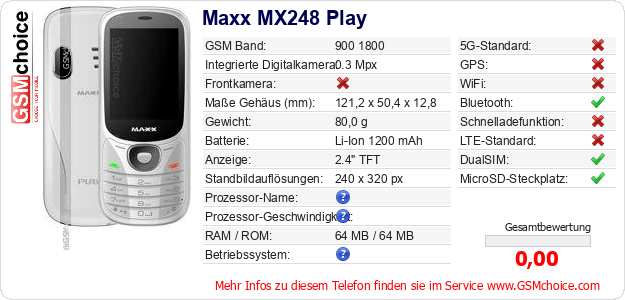 Hast du eigene Webseite? Willst du die Informationen über Standarddaten des Handys Maxx MX248 Play irgendwo veröffentlichen? Das ist sehr einfach. Du kannst das Bild herunterladen oder kopieren und auf der Webseite folgenden Code hinzufügen:Das Einfügen von diesem Code verursacht das Anzeigen von dem folgenden Bild:
