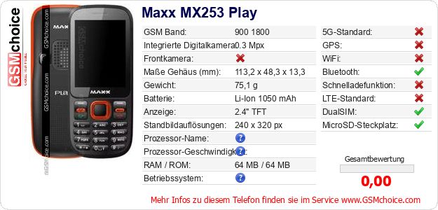 Hast du eigene Webseite? Willst du die Informationen über Standarddaten des Handys Maxx MX253 Play irgendwo veröffentlichen? Das ist sehr einfach. Du kannst das Bild herunterladen oder kopieren und auf der Webseite folgenden Code hinzufügen:Das Einfügen von diesem Code verursacht das Anzeigen von dem folgenden Bild: