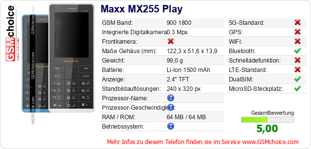 Hast du eigene Webseite? Willst du die Informationen über Standarddaten des Handys Maxx MX255 Play irgendwo veröffentlichen? Das ist sehr einfach. Du kannst das Bild herunterladen oder kopieren und auf der Webseite folgenden Code hinzufügen:Das Einfügen von diesem Code verursacht das Anzeigen von dem folgenden Bild: