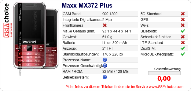 Hast du eigene Webseite? Willst du die Informationen über Standarddaten des Handys Maxx MX372 Plus irgendwo veröffentlichen? Das ist sehr einfach. Du kannst das Bild herunterladen oder kopieren und auf der Webseite folgenden Code hinzufügen:Das Einfügen von diesem Code verursacht das Anzeigen von dem folgenden Bild: