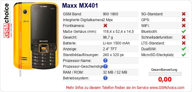 Hast du eigene Webseite? Willst du die Informationen über Standarddaten des Handys Maxx MX401 irgendwo veröffentlichen? Das ist sehr einfach. Du kannst das Bild herunterladen oder kopieren und auf der Webseite folgenden Code hinzufügen:Das Einfügen von diesem Code verursacht das Anzeigen von dem folgenden Bild: