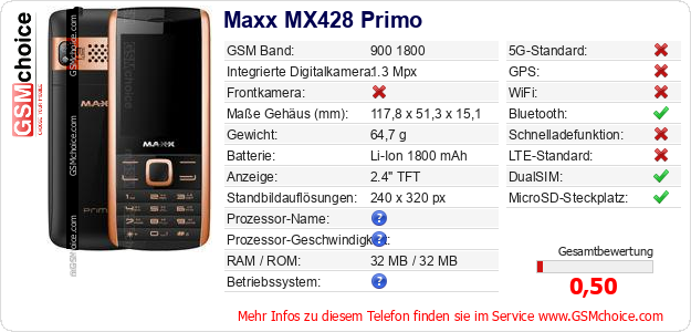 Hast du eigene Webseite? Willst du die Informationen über Standarddaten des Handys Maxx MX428 Primo irgendwo veröffentlichen? Das ist sehr einfach. Du kannst das Bild herunterladen oder kopieren und auf der Webseite folgenden Code hinzufügen:Das Einfügen von diesem Code verursacht das Anzeigen von dem folgenden Bild: