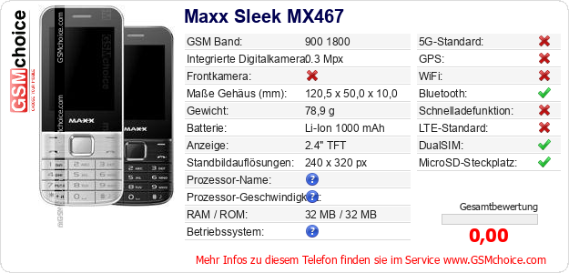 Hast du eigene Webseite? Willst du die Informationen über Standarddaten des Handys Maxx Sleek MX467 irgendwo veröffentlichen? Das ist sehr einfach. Du kannst das Bild herunterladen oder kopieren und auf der Webseite folgenden Code hinzufügen:Das Einfügen von diesem Code verursacht das Anzeigen von dem folgenden Bild: