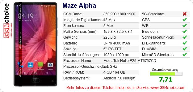 Hast du eigene Webseite? Willst du die Informationen über Standarddaten des Handys Maze Alpha irgendwo veröffentlichen? Das ist sehr einfach. Du kannst das Bild herunterladen oder kopieren und auf der Webseite folgenden Code hinzufügen:Das Einfügen von diesem Code verursacht das Anzeigen von dem folgenden Bild: