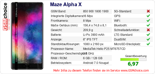 Hast du eigene Webseite? Willst du die Informationen über Standarddaten des Handys Maze Alpha X irgendwo veröffentlichen? Das ist sehr einfach. Du kannst das Bild herunterladen oder kopieren und auf der Webseite folgenden Code hinzufügen:Das Einfügen von diesem Code verursacht das Anzeigen von dem folgenden Bild: