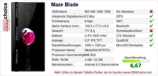 Hast du eigene Webseite? Willst du die Informationen über Standarddaten des Handys Maze Blade irgendwo veröffentlichen? Das ist sehr einfach. Du kannst das Bild herunterladen oder kopieren und auf der Webseite folgenden Code hinzufügen:Das Einfügen von diesem Code verursacht das Anzeigen von dem folgenden Bild: