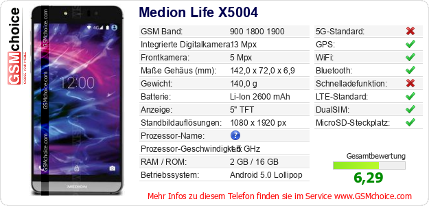 Hast du eigene Webseite? Willst du die Informationen über Standarddaten des Handys Medion Life X5004 irgendwo veröffentlichen? Das ist sehr einfach. Du kannst das Bild herunterladen oder kopieren und auf der Webseite folgenden Code hinzufügen:Das Einfügen von diesem Code verursacht das Anzeigen von dem folgenden Bild: