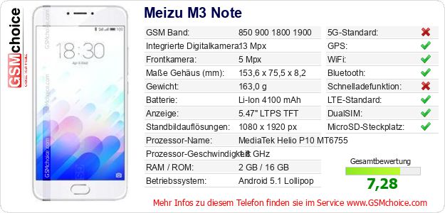 Hast du eigene Webseite? Willst du die Informationen über Standarddaten des Handys Meizu M3 Note irgendwo veröffentlichen? Das ist sehr einfach. Du kannst das Bild herunterladen oder kopieren und auf der Webseite folgenden Code hinzufügen:Das Einfügen von diesem Code verursacht das Anzeigen von dem folgenden Bild: