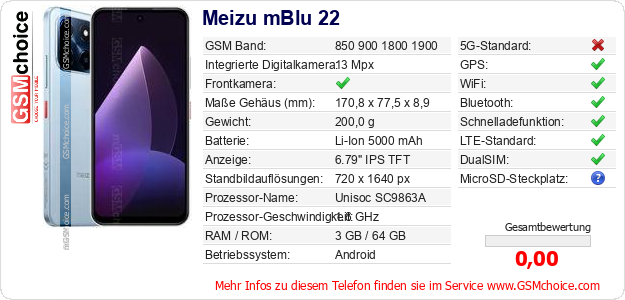 Hast du eigene Webseite? Willst du die Informationen über Standarddaten des Handys Meizu mBlu 22 irgendwo veröffentlichen? Das ist sehr einfach. Du kannst das Bild herunterladen oder kopieren und auf der Webseite folgenden Code hinzufügen:Das Einfügen von diesem Code verursacht das Anzeigen von dem folgenden Bild: