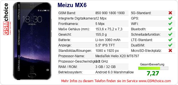 Hast du eigene Webseite? Willst du die Informationen über Standarddaten des Handys Meizu MX6 irgendwo veröffentlichen? Das ist sehr einfach. Du kannst das Bild herunterladen oder kopieren und auf der Webseite folgenden Code hinzufügen:Das Einfügen von diesem Code verursacht das Anzeigen von dem folgenden Bild: