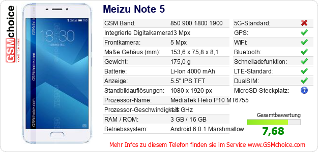 Hast du eigene Webseite? Willst du die Informationen über Standarddaten des Handys Meizu Note 5 irgendwo veröffentlichen? Das ist sehr einfach. Du kannst das Bild herunterladen oder kopieren und auf der Webseite folgenden Code hinzufügen:Das Einfügen von diesem Code verursacht das Anzeigen von dem folgenden Bild: