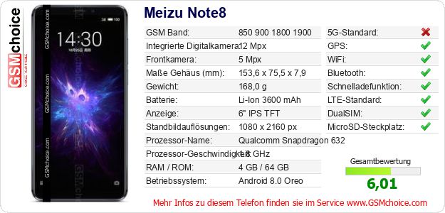 Hast du eigene Webseite? Willst du die Informationen über Standarddaten des Handys Meizu Note8 irgendwo veröffentlichen? Das ist sehr einfach. Du kannst das Bild herunterladen oder kopieren und auf der Webseite folgenden Code hinzufügen:Das Einfügen von diesem Code verursacht das Anzeigen von dem folgenden Bild: