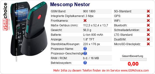 Hast du eigene Webseite? Willst du die Informationen über Standarddaten des Handys Mescomp Nestor irgendwo veröffentlichen? Das ist sehr einfach. Du kannst das Bild herunterladen oder kopieren und auf der Webseite folgenden Code hinzufügen:Das Einfügen von diesem Code verursacht das Anzeigen von dem folgenden Bild: