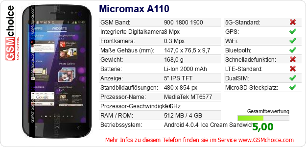 Hast du eigene Webseite? Willst du die Informationen über Standarddaten des Handys Micromax A110 irgendwo veröffentlichen? Das ist sehr einfach. Du kannst das Bild herunterladen oder kopieren und auf der Webseite folgenden Code hinzufügen:Das Einfügen von diesem Code verursacht das Anzeigen von dem folgenden Bild: