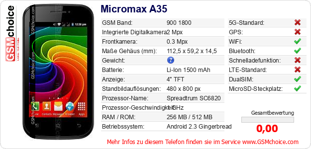 Hast du eigene Webseite? Willst du die Informationen über Standarddaten des Handys Micromax A35 irgendwo veröffentlichen? Das ist sehr einfach. Du kannst das Bild herunterladen oder kopieren und auf der Webseite folgenden Code hinzufügen:Das Einfügen von diesem Code verursacht das Anzeigen von dem folgenden Bild: