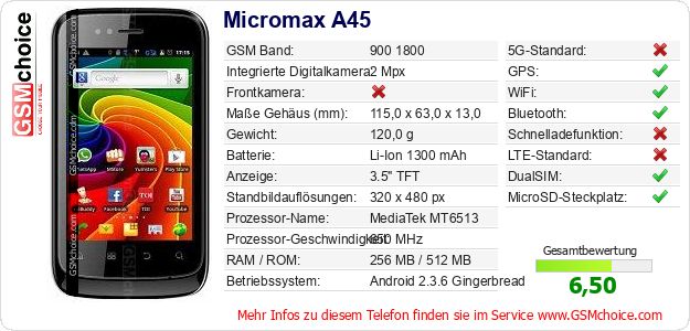 Hast du eigene Webseite? Willst du die Informationen über Standarddaten des Handys Micromax A45 irgendwo veröffentlichen? Das ist sehr einfach. Du kannst das Bild herunterladen oder kopieren und auf der Webseite folgenden Code hinzufügen:Das Einfügen von diesem Code verursacht das Anzeigen von dem folgenden Bild: