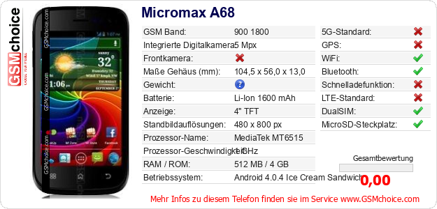 Hast du eigene Webseite? Willst du die Informationen über Standarddaten des Handys Micromax A68 irgendwo veröffentlichen? Das ist sehr einfach. Du kannst das Bild herunterladen oder kopieren und auf der Webseite folgenden Code hinzufügen:Das Einfügen von diesem Code verursacht das Anzeigen von dem folgenden Bild: