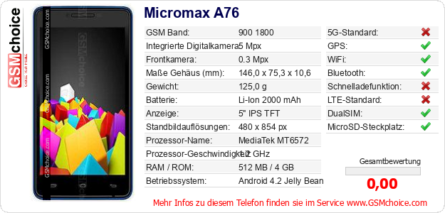 Hast du eigene Webseite? Willst du die Informationen über Standarddaten des Handys Micromax A76 irgendwo veröffentlichen? Das ist sehr einfach. Du kannst das Bild herunterladen oder kopieren und auf der Webseite folgenden Code hinzufügen:Das Einfügen von diesem Code verursacht das Anzeigen von dem folgenden Bild: