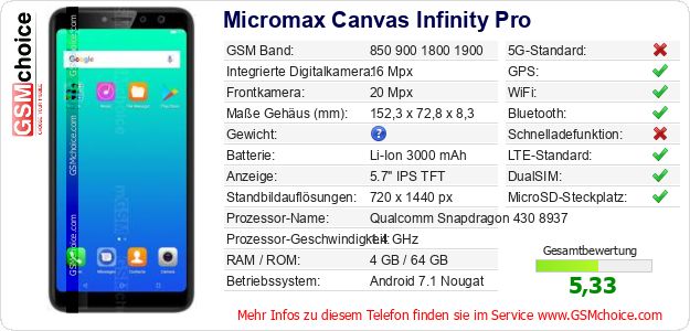 Hast du eigene Webseite? Willst du die Informationen über Standarddaten des Handys Micromax Canvas Infinity Pro irgendwo veröffentlichen? Das ist sehr einfach. Du kannst das Bild herunterladen oder kopieren und auf der Webseite folgenden Code hinzufügen:Das Einfügen von diesem Code verursacht das Anzeigen von dem folgenden Bild: