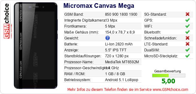 Hast du eigene Webseite? Willst du die Informationen über Standarddaten des Handys Micromax Canvas Mega irgendwo veröffentlichen? Das ist sehr einfach. Du kannst das Bild herunterladen oder kopieren und auf der Webseite folgenden Code hinzufügen:Das Einfügen von diesem Code verursacht das Anzeigen von dem folgenden Bild: