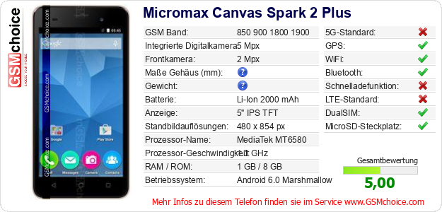 Hast du eigene Webseite? Willst du die Informationen über Standarddaten des Handys Micromax Canvas Spark 2 Plus irgendwo veröffentlichen? Das ist sehr einfach. Du kannst das Bild herunterladen oder kopieren und auf der Webseite folgenden Code hinzufügen:Das Einfügen von diesem Code verursacht das Anzeigen von dem folgenden Bild: