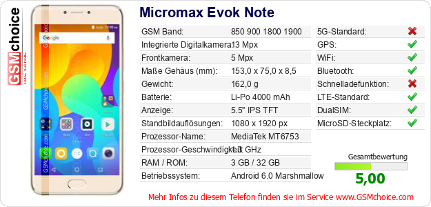 Hast du eigene Webseite? Willst du die Informationen über Standarddaten des Handys Micromax Evok Note irgendwo veröffentlichen? Das ist sehr einfach. Du kannst das Bild herunterladen oder kopieren und auf der Webseite folgenden Code hinzufügen:Das Einfügen von diesem Code verursacht das Anzeigen von dem folgenden Bild: