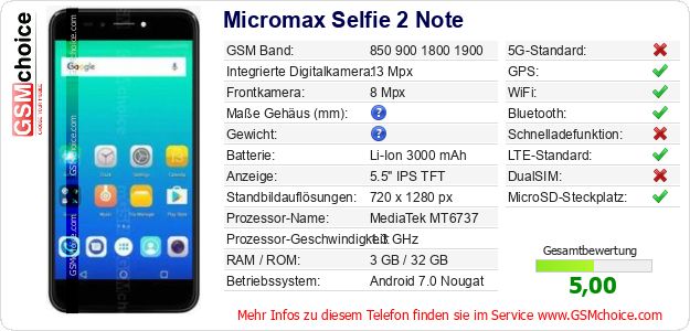 Hast du eigene Webseite? Willst du die Informationen über Standarddaten des Handys Micromax Selfie 2 Note irgendwo veröffentlichen? Das ist sehr einfach. Du kannst das Bild herunterladen oder kopieren und auf der Webseite folgenden Code hinzufügen:Das Einfügen von diesem Code verursacht das Anzeigen von dem folgenden Bild: