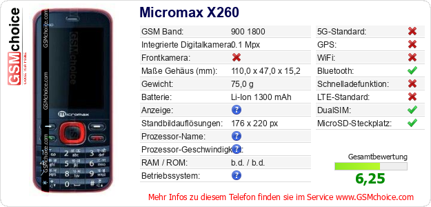 Hast du eigene Webseite? Willst du die Informationen über Standarddaten des Handys Micromax X260 irgendwo veröffentlichen? Das ist sehr einfach. Du kannst das Bild herunterladen oder kopieren und auf der Webseite folgenden Code hinzufügen:Das Einfügen von diesem Code verursacht das Anzeigen von dem folgenden Bild: