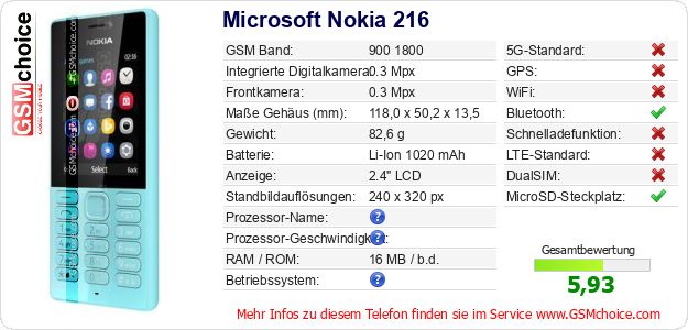 Hast du eigene Webseite? Willst du die Informationen über Standarddaten des Handys Microsoft Nokia 216 irgendwo veröffentlichen? Das ist sehr einfach. Du kannst das Bild herunterladen oder kopieren und auf der Webseite folgenden Code hinzufügen:Das Einfügen von diesem Code verursacht das Anzeigen von dem folgenden Bild: