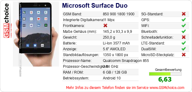 Hast du eigene Webseite? Willst du die Informationen über Standarddaten des Handys Microsoft Surface Duo irgendwo veröffentlichen? Das ist sehr einfach. Du kannst das Bild herunterladen oder kopieren und auf der Webseite folgenden Code hinzufügen:Das Einfügen von diesem Code verursacht das Anzeigen von dem folgenden Bild: